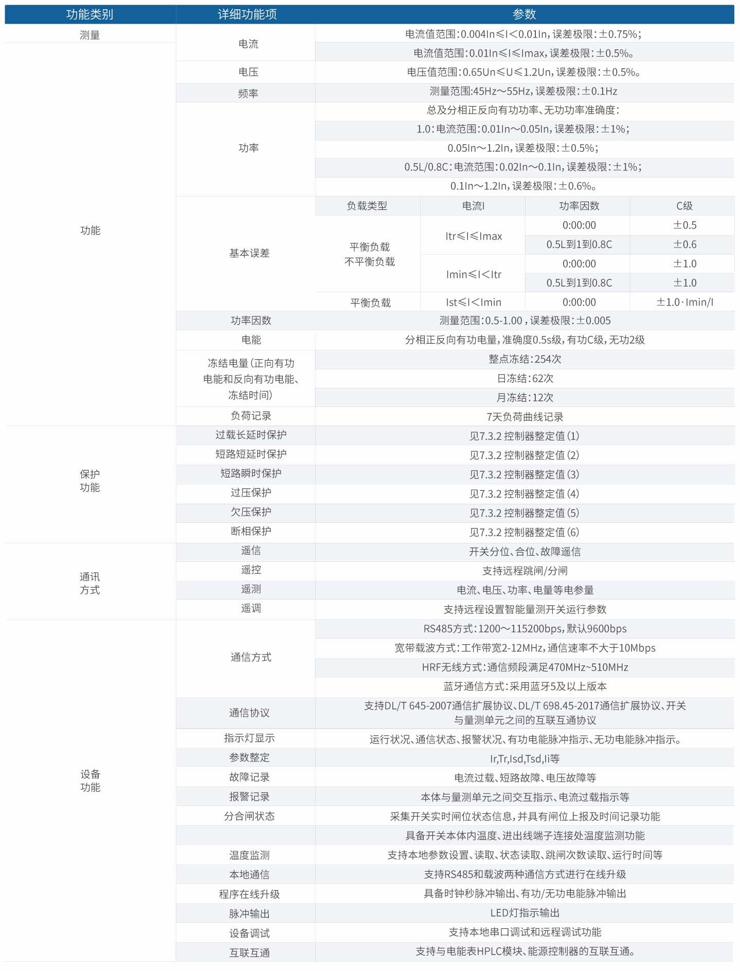 智能量测开关具有双模通信(HPLC+HRF)、高精度交流采样、供电关系拓扑识别、计量箱管理、窃电预警、停电事件上报、线损分析研判、端子温度检测、故障自动诊断等多项物联感知功能,具有过载长延时、短路短延时、短路瞬时、过欠压及断相保护功能,多种保护功能对线路和电源设备起到保护作用,量测单元支持热插拔和可互换。并对负载端的检测和监控可降低电网的运维成本,为将来的能效系统提供必要的数据。