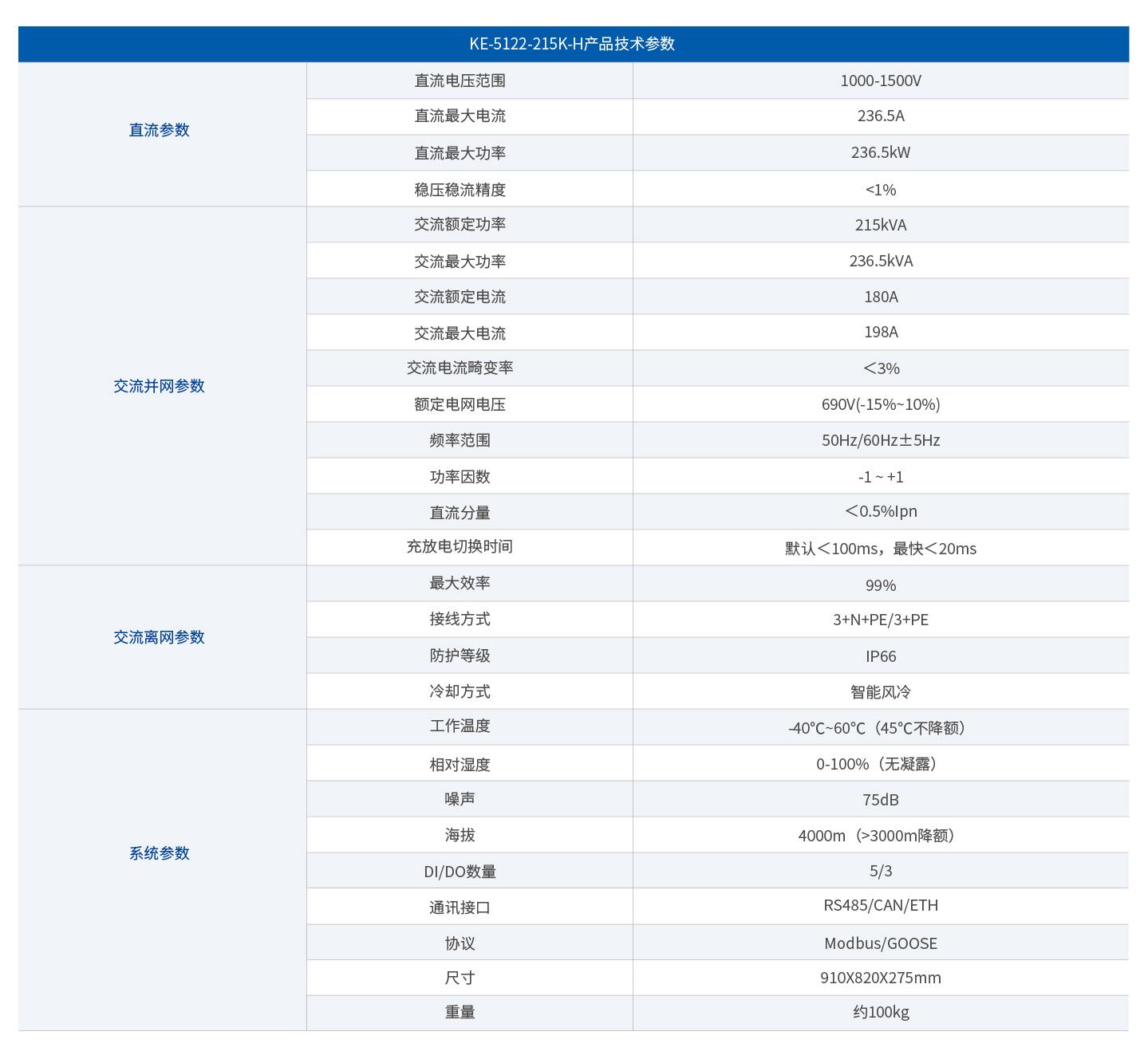 支持多机并联MW级扩容,交流额定功率215kVA(最大236.5kVA),1500V宽压输入不降额,充放电切换最快<20ms。