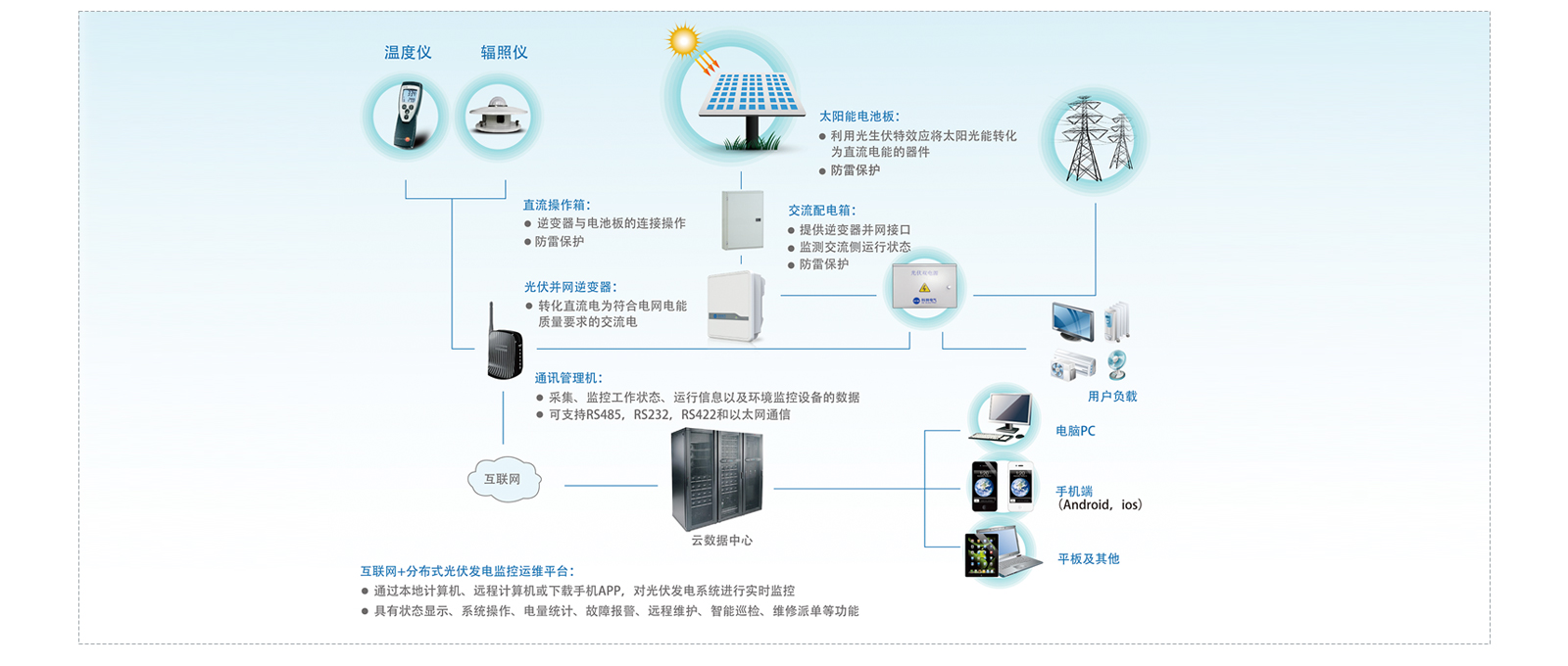 光伏逆变器、采集装置、并网保护设备、监控运维平台等全部自主研发,提供专业的整体解决方案。